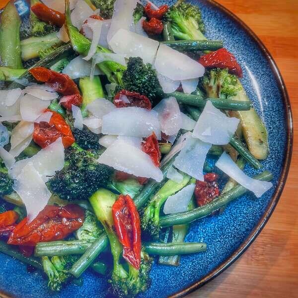 Kom grøntsagerne på et fad og tilføj soltørrede tomater og revet parmesanost.